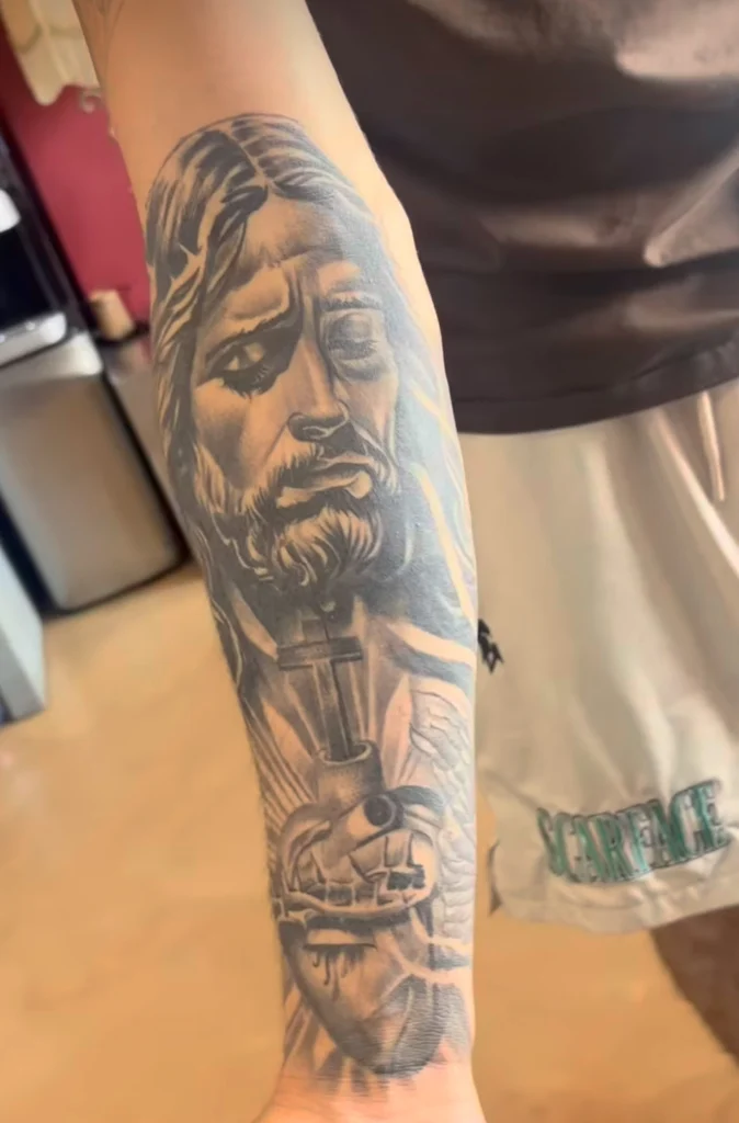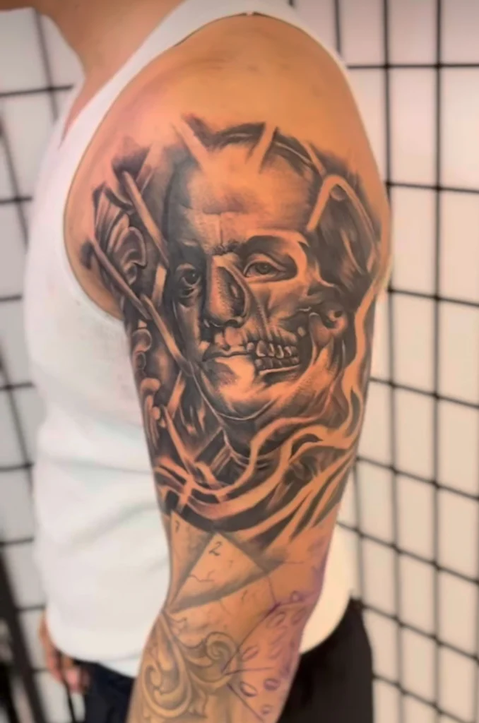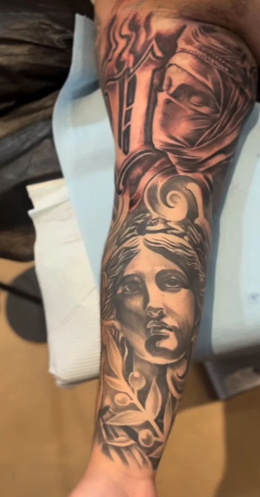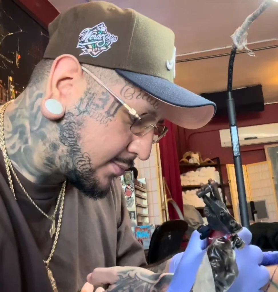 Jay focuses on high-contrast black and gray tattooing, with particular strength in lettering and graffiti-style work. His approach is clean, bold, and intentional, making him well-suited for large or graphic pieces. Jay offers half-day and full-day rates and is known for an efficient, professional workflow that respects both the art and the client’s time.